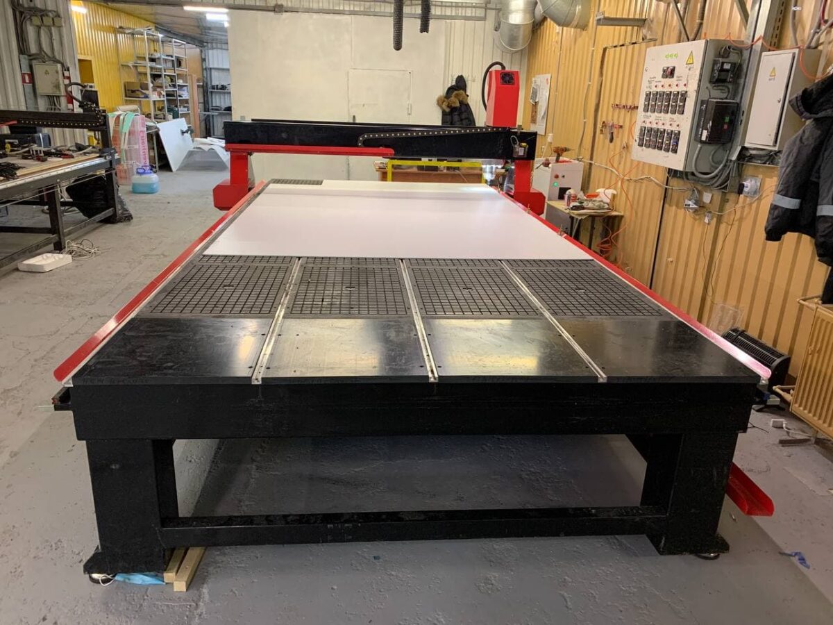 Большие размеры рабочего стола фрезерного станка нам нужны для того чтобы вырезать огромные штуки из больших листов материала. Например, детали для рекламных конструкций — стендов, промо-стоек, стеллажей, и т.д. Потом из таких деталей собираются стенды для выставок или промо-объекты для различных мероприятий. Очень помогает этот станок в изготовлении элементов наружной рекламы, например, объёмных световых и несветовых букв, прочих больших деталей вывесок и крышных конструкций. Например, вот такую фигурную подложку под вывеску из цельного листа ПВХ вырезали на нем не так давно.