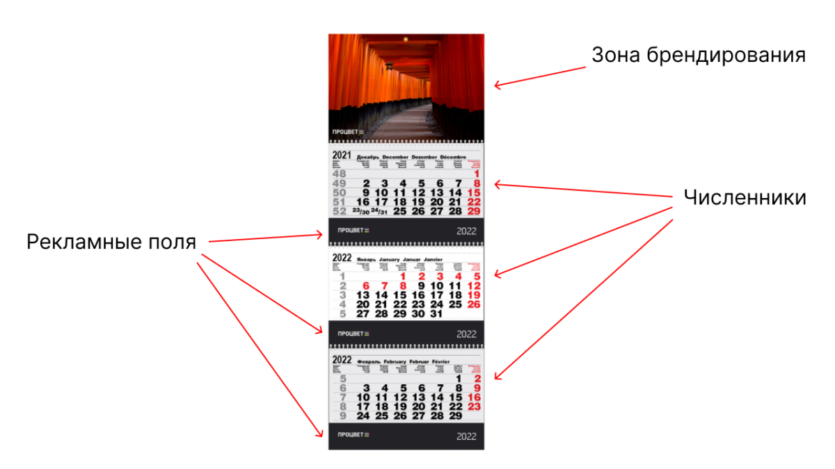 Любой календарь (а мы сейчас говорим только про рекламные календари) состоит из трех частей: численник, зона брендирования и рекламные поля. Это касается любого календаря, хоть карманного, хоть любимца бухгалтерии квартального Трио.