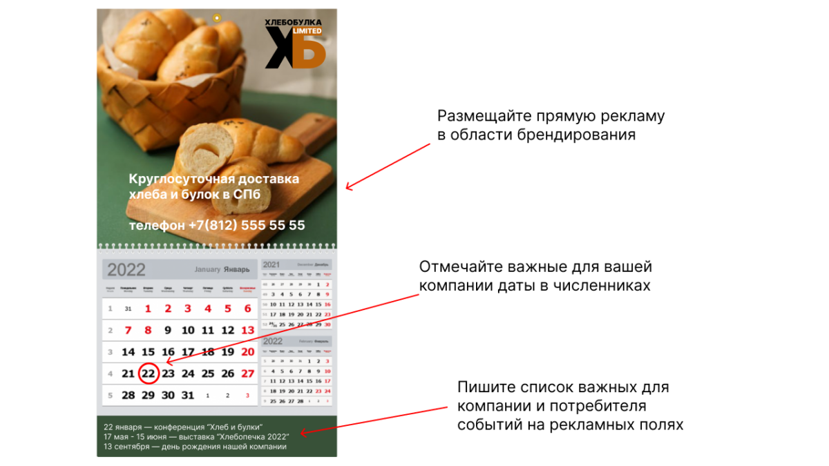 Напишите на рекламном поле важные для вашей компании даты этого года. Например, день рождения компании. Дату открытия профильной выставки, в которой вы принимаете участие (особенно, если вы организовываете такую выставку). Даты профильных конференций с вашим участием. Да даже даты рекламных акций — почему бы нет?