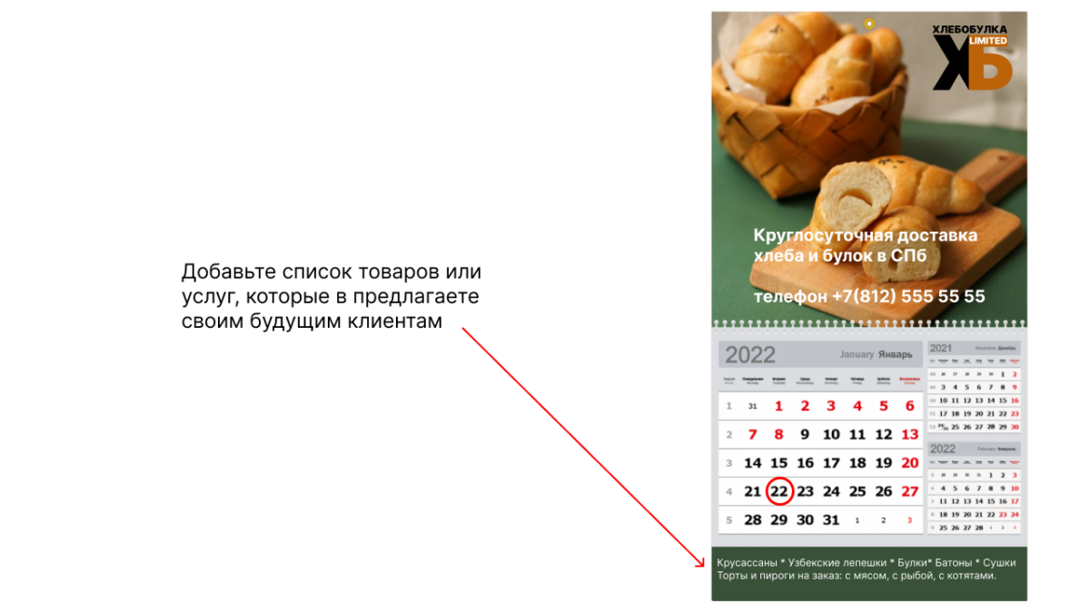 На рекламном поле календаря можно писать всё, что будет вам полезно, всё, что поможет привлечь новых клиентов, поможет продать продукт. Вот несколько примеров: