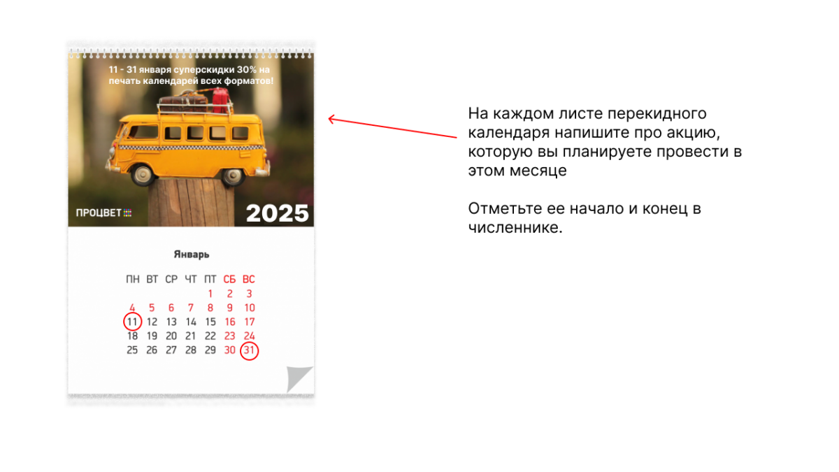 Кстати, даты рекламных акций можно отмечать не только на рекламных полях, но и в численниках, если вы заказываете их оригинальную печать. Обведите даты начала и конца акций кружочками, опишите их название внизу — и готово. Например, дату старта осенних распродаж, начало и конец сезона Рождественских скидок, весенние акции, и так далее.