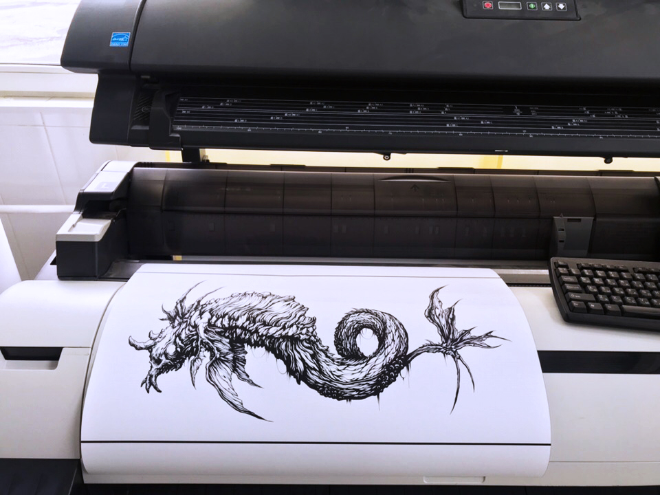 Рисуются эскизы, конечно, вручную, ведь подавляющее большинство татуировщиков — настоящие художники, со своим авторским стилем. Готовые рисунки сканируются и распечатываются. Печатаются такие эскизы, естественно, не на домашнем струйном принтере, а на профессиональной печатной машине. Например, на нашем цифровом принтере для интерьерной печати с высоким разрешением. На готовом отпечатанном эскизе прекрасно видны мельчайшие детали и полутона сложного рисунка.
