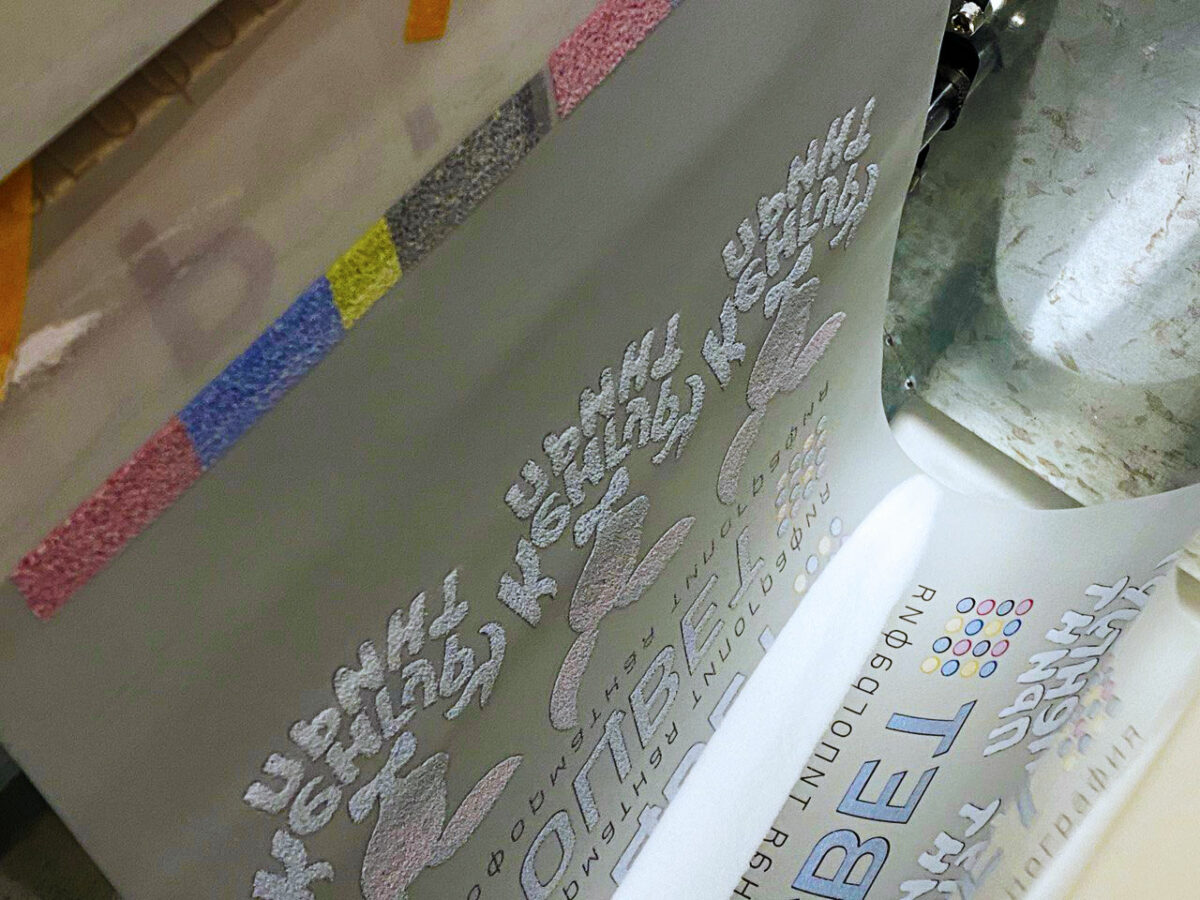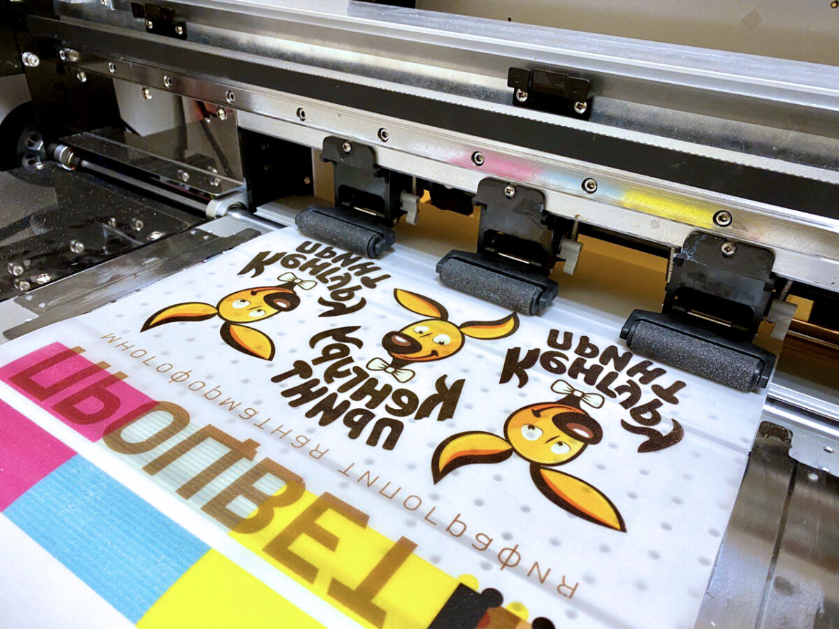 Подготовленный в графическом редакторе макет печатается в зеркальном виде на струйной печатной машине с использованием специальных текстильных пигментных DTF-чернилам. Их особенность состоит в том, что после печати на специальной пленке они не высыхают сразу, как обычные чернила для принтера, но и не растекаются. Этому способствуют и свойства плёнки. В общем, получается картинка с сырыми чернилами.