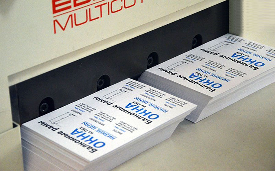 Листовки печатаются с одной или с двух сторон бумажного листа формата А3. Затем листы разрезаются на флаеры нужного формата на гильотине или вырубаются прессом. Времени это занимает совсем немного. Например, печать и резка сотни листовок займет от силы минут десять чистого рабочего времени.