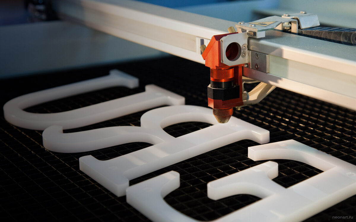 Если стенд классический, прямоугольный или квадратный — ПВХ пилят обычной пилой или электролобзиком. Если же нужна какая-то особая форма, то в дело вступает лазер. Основания нестандартной формы вырезаются на станке для лазерной резки и гравировки. Тонкий луч лазера под управлением умного компьютера вырежет из пластика всё в точности, так, как и было задумано дизайнером. Хотя и с прямоугольником лазер справится на отлично.