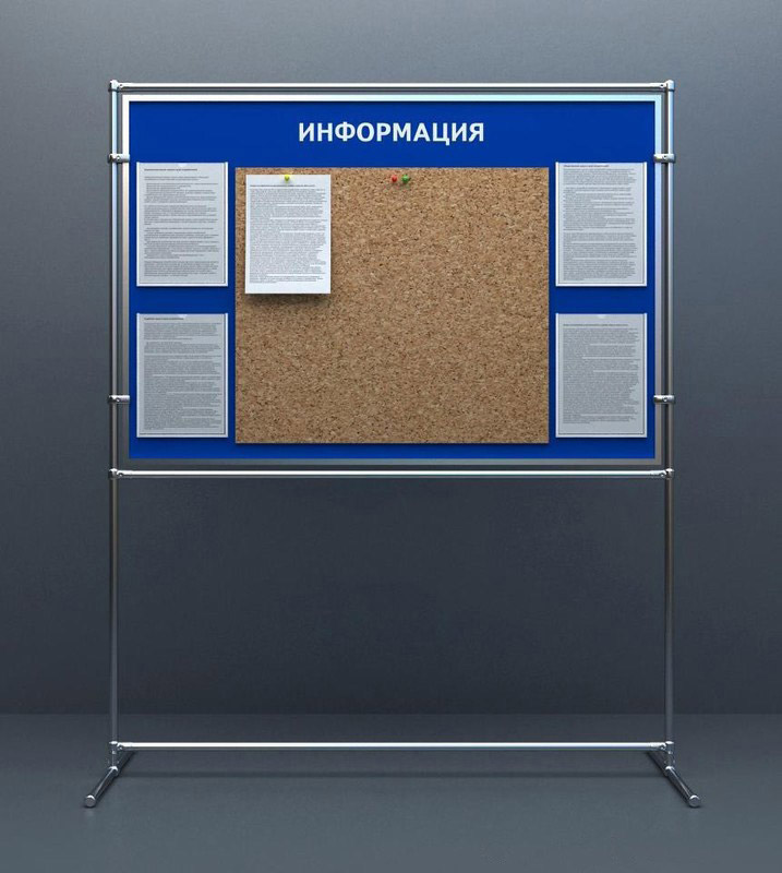 5. Стенд-стойка. Этот вариант используется в тех случаях, когда стенд нужно время от времени перемещать. К основанию стенда прикручивается конструкция — две ножки для установки. Высота их определяется во время проектирования самого стенда так, чтобы само поле стенда было расположено чуть выше уровня глаз человека среднего роста.