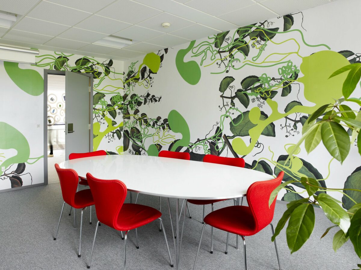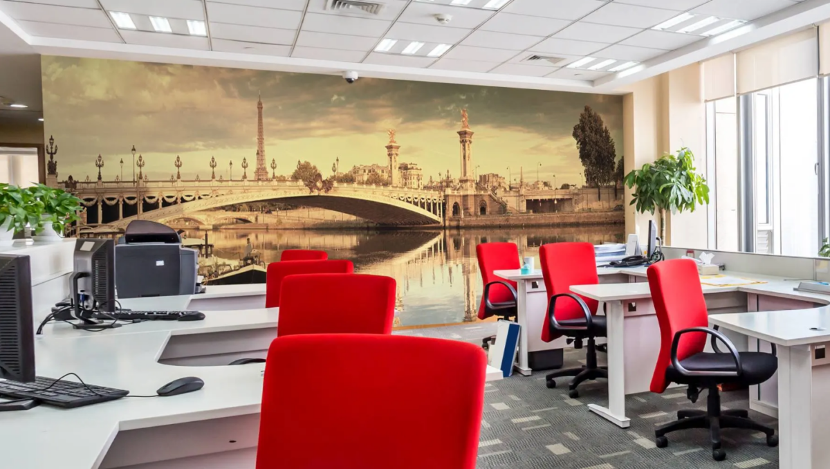 Еще один вариант оформления офисного пространства — фотообои. Одна или несколько стен, оформленных в определенной тематике, помогут создать нужное рабочее настроение у сотрудников или клиентов