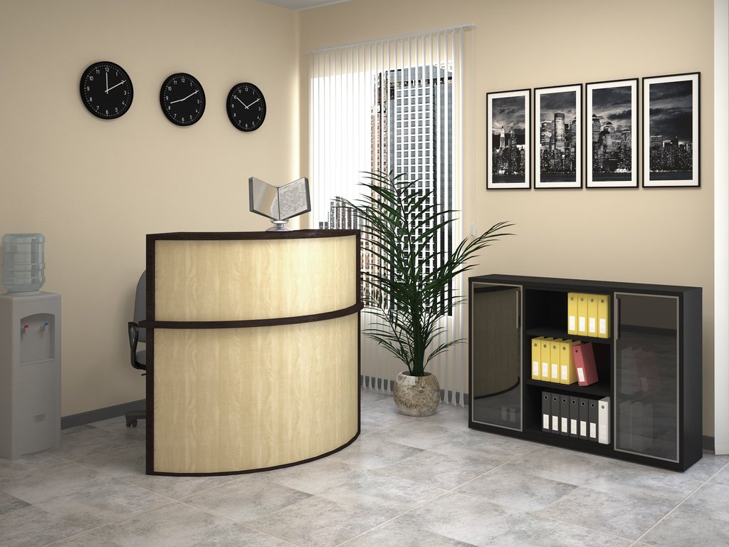 Первое помещение, в которое попадает посетитель офиса — это приемная и зона ресепшн. В 99% случаев здесь располагается стойка, за которой сидит красивая девушка-секретарь, диван или кресла для ожидающих гостей, огромный напольный цветок и настенные часы. Иногда этот набор мебели дополняет висящий где-то у потолка телевизор, который беззвучно транслирует музыкальные клипы.