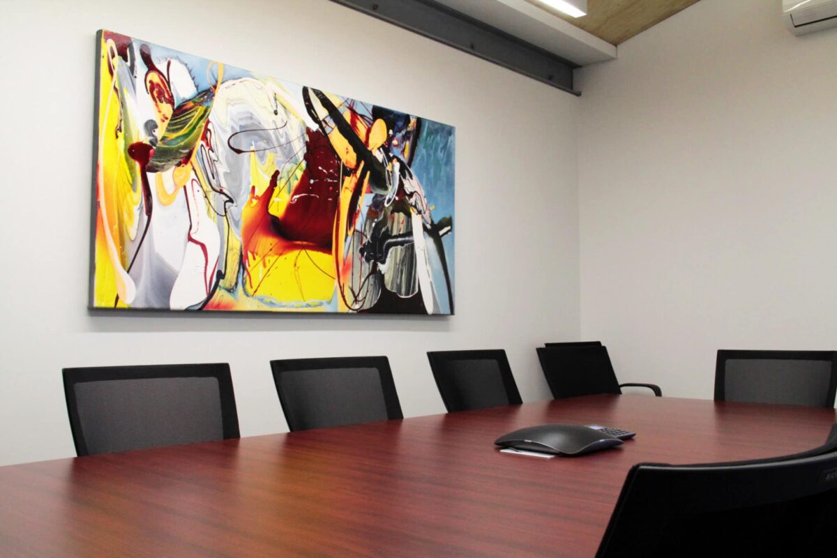 Переговорка — это второе помещение, в которое попадет ваш будущий клиент, и здесь вам тоже нужно произвести на него впечатление. Большое абстрактное полотно во всю стену прекрасно с этим справится. Особенно, если это картина кисти более-менее известного художника или репродукция такой картины, напечатанная на натуральном холсте с эффектом настоящей живописи.