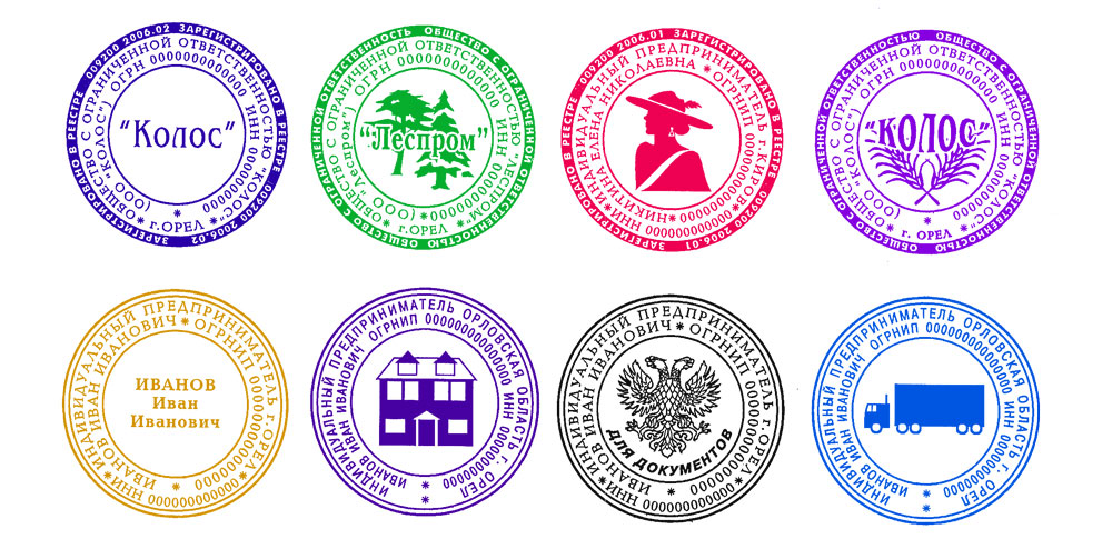 Конечно, изготовление печати начинается с разработки ее дизайна. Классическая форма печати для организаций и ИП — круглый оттиск диаметром 38 – 40 мм. В центре круга располагается название компании, логотип или ФИО предпринимателя, а по кругу размещаются необходимые данные о компании: ИНН, ОГРНИП, адрес и т.д.