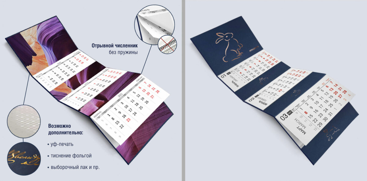 По вашему желанию можно сделать подложку такого календаря еще более плотной — полностью из кашированного картона. На такой подложке очень стильно и солидно смотрится изображение, выполненное методом тиснения.