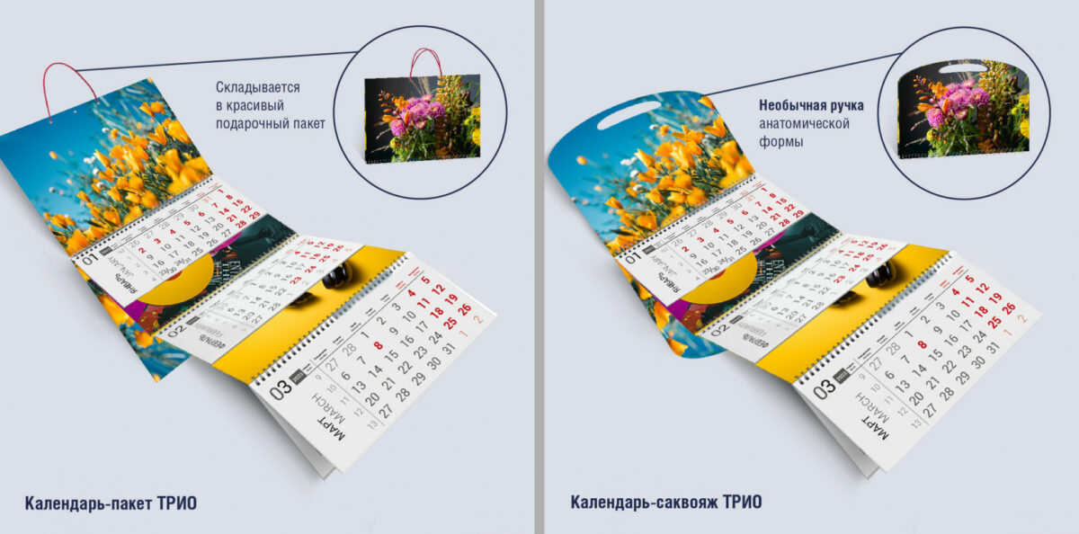 Да, да, вы все правильно прочитали. Переносные квартальные календари-трио с ручками для переноски — это прям хит сезона. Такие календари по достоинству оценят бухгалтеры-фрилансеры, например. А что, удобно же: пришел в компанию, сел за стол, развернул принесенный с собой календарь, поработал, собрал календарь и пошел в другую компанию считать их прибыли.