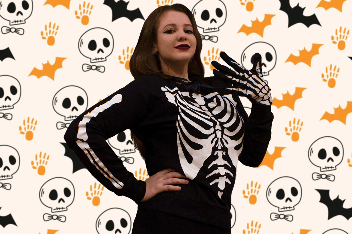 - Сделать себе на заказ черную футболку со страшными принтами в стиле Хеллоуина. Кости, черепа, тыквы — всё такое.