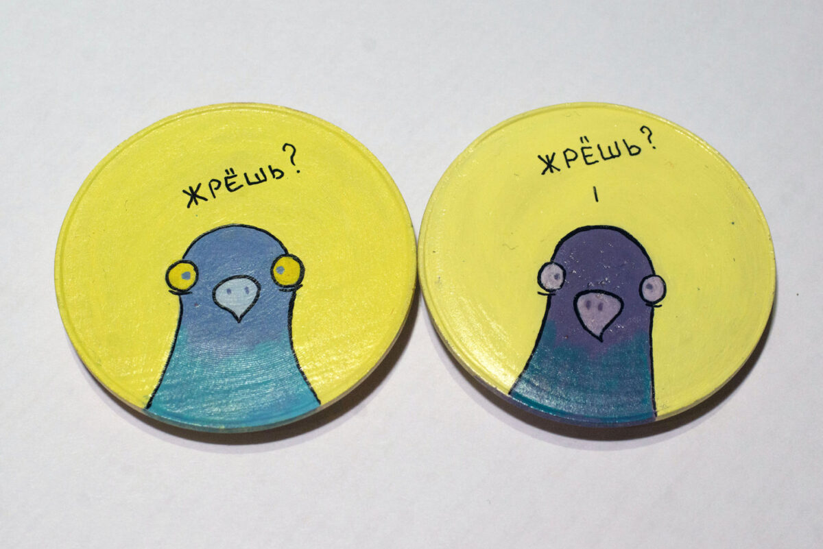 Изображение печатается на простой бумаге. Конечно, можно взять и не очень простую бумагу, а какую-нибудь особую — тут всё на ваше усмотрение. Отпечатанное изображение ламинируется и вырубается при помощи штампа. Потом вырубленная заготовка вместе с основанием и задней крышечкой, к которой уже прикреплен магнит, вставляется в специальный пресс для изготовления закатных значков и магнитов. Два движения оператора — и всё готово.