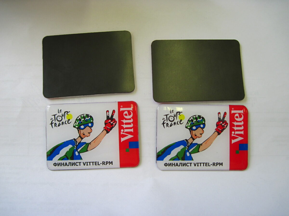 Так же, как и в случае с простыми виниловыми магнитами, изображение печатается на самоклейке, и сразу же вырезаются по форме будущего магнита. После резки картинки заливаются сверху полимерной смолой и отправляются в УФ-печь, где под воздействием ультрафиолета смола быстро и качественно застывает. Ну а после сушки готовые наклейки со смолой приклеивают к таким же заранее вырубленным заготовкам из магнитного винила. И всё.