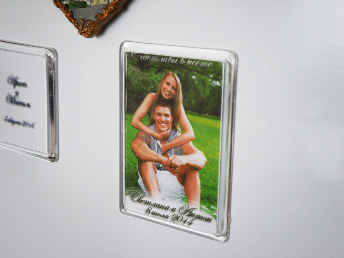В последнее время такие магнитики полюбились свадебным фотографам и организаторам свадеб. При наличии маленького портативного принтера сделать моментальное фото со свадьбы не составит труда. А уж засунуть его в магнитный акриловый корпус — и вовсе пара секунд. Единственный минус: все такие быстрые магнитики будут одного или двух стандартных размеров.
