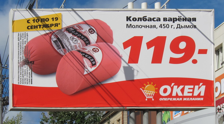 - Акценты поменьше могут быть, в качестве одного-двух вспомогательных элементов. Например, значок скидки или цена товара. Обратите внимание на биллборды больших торговых сетей — это отличные примеры того, как нужно подавать рекламу товаров на биллбордах.