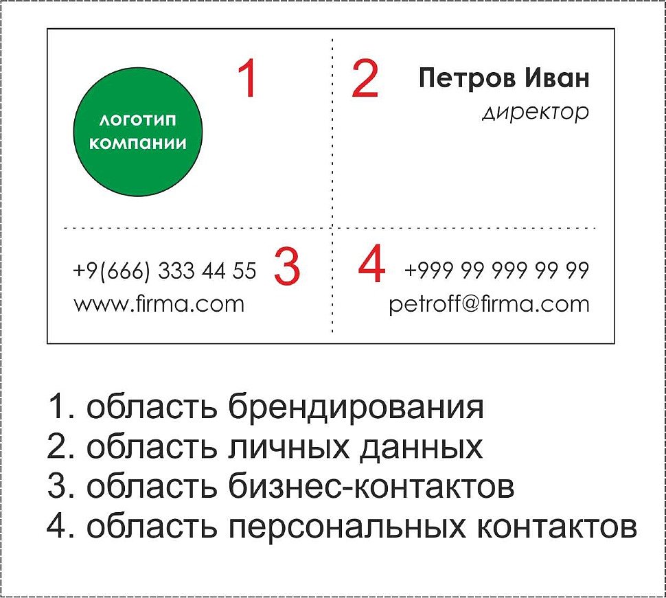 Хорошая визитка должна хорошо читаться и отвечать на три главных вопроса: как вас зовут, кто вы и как с вами связаться. Получатель сразу должен увидеть все основные элементы: логотип, ваши имя и фамилию, личные контакты и контакты вашей компании. Примерно так выглядит одна из классических схем бизнес-визиток:
