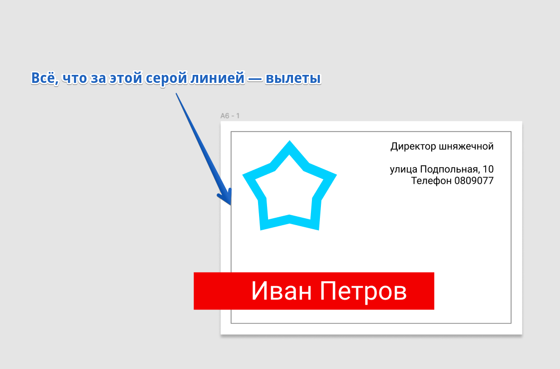 Она будет обрезаться по серым линиям, а всё что за линией, уйдет в мусор. Это и есть вылеты. Зато красная плашка будет выглядеть так, как нужно, начинаться с самого края визитки.