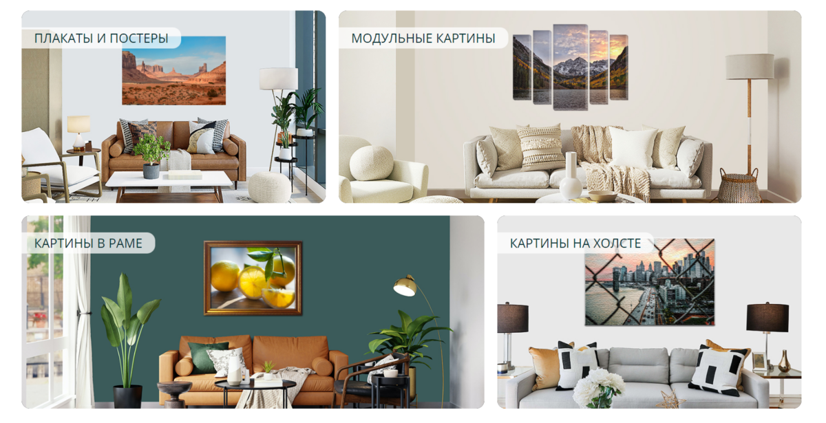Если вкратце — это онлайн-сервис для заказа картин, постеров или плакатов. Здесь нет офиса, и всё общение с менеджерами проекта происходит удалённо. Выставочный зал с образами, шоурум, и даже сервис искусственного интеллекта для создания собственных уникальных картин — всё это находится в виртуальном пространстве. А вот магазина с картинами нет — мы не продаем готовые работы. Всё под индивидуальный заказ.