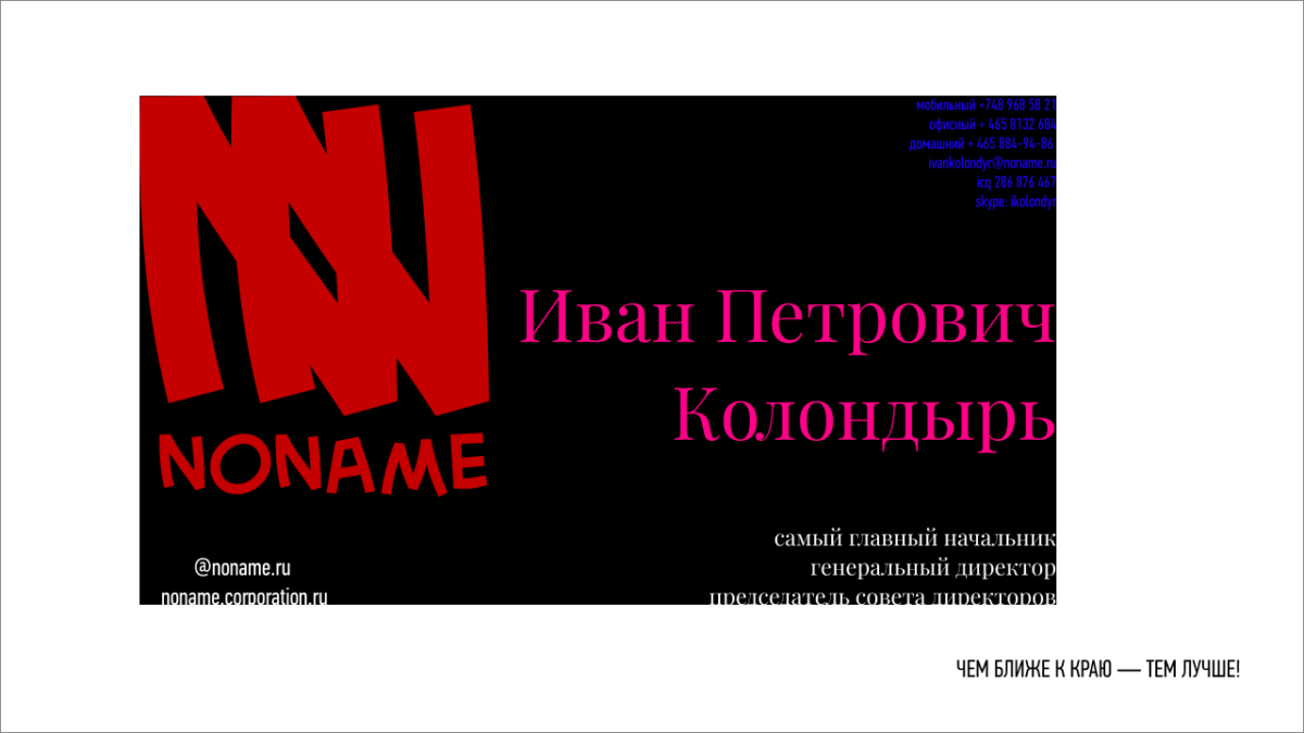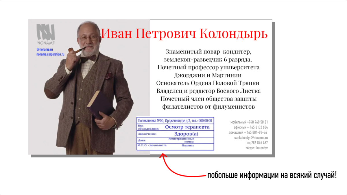 Пишите на визитке всё, что даже теоретически может понадобиться вашим визави. Свои имя, фамилию, год рождения, домашний и рабочий адрес, все ныне занимаемые и прошлые должности, титулы и звания. Все, какие есть, телефоны, мобильные, служебные и домашние, все мессенджеры (не забудьте аську и дискорд). Обязательно добавьте ссылку на свой сайт, на свой прошлый сайт и на лендинг, где сейчас проходит акция-распродажа. Напишите ссылки на свои профили в Одноклассниках и Вконтакте, пусть и там вас смогут найти.