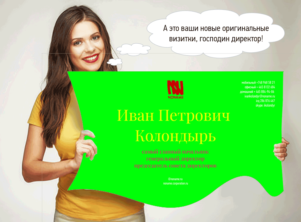 Отлично будет, если вы поместите на визитку свою фотографию, лучше цветную. Чтобы ее хорошо видели, пусть она занимает большую часть визитки. Просто напишете всё остальное мелким шрифтом, кому надо, тот всё равно разглядит. Добавьте к фотографии логотип компании, товарный знак вашего продукта и сам продукт.