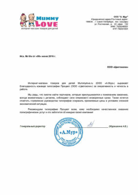 Интернет-магазин товаров для детей «Mummy Love» (ООО «А.Мур») выражает благодарность команде типографии Процвет (ООО «Цветокопи») за оперативность и четкость в работе.