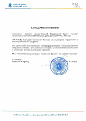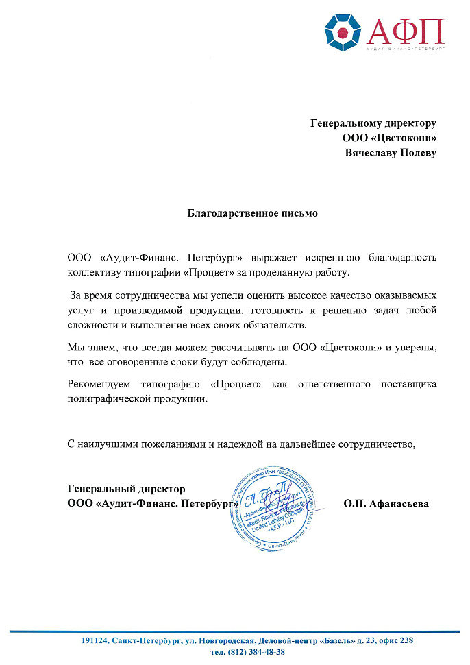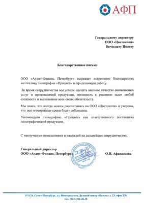 ООО «Аудит-Финанс. Петербург» выражает искреннюю благодарность коллективу типографии «Процвет» за проделанную работу. За время сотрудничества мы успели оценить высокое качество оказываемых услуг и производимой продукции, готовность к решению задач любой сложности и выполнение всех своих обязательств.