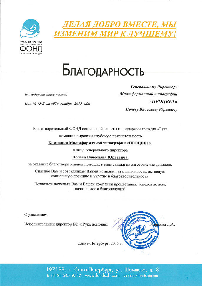 Благотворительный Фонд социальной защиты и поддержки граждан «Рука помощи» выражает глубокую признательность Компании Многоформатной типографии «Процвет» за оказание благотворительной помощи, в виде скидки на изготовление флажков. Спасибо Вам и сотрудникам Вашей компании за отзывчивость, активную социальную позицию и участие в благотворительности. Позвольте пожелать Вам и Вашей компании процветания, успехов по всех начинаниях и благополучия!