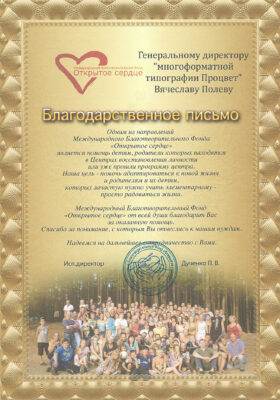 Международный Благотворительный Фонд «Открытое сердце» от всей души благодарит Вас за оказанную помощь. Спасибо за понимание, с которым Вы отнеслись к нашим нуждам. Надеемся на дальнейшее сотрудничество с Вами.